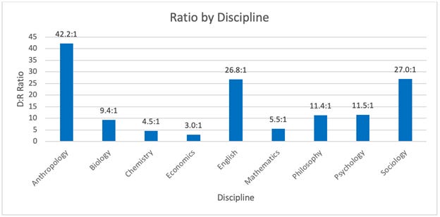 When Jonathan Haidt, Chris Martin, and Nicholas Rosenkranz began Heterodox Academy in 2015, they were pointing out a decades long trend in universities. There probably have always been differences in the partisan affiliations of the people attracted to different jobs,[19] and academia is no different, though the ratios vary widely.[20] This ranges from 3:1 advantage for Democrats over Republicans in economics departments in flagship colleges to 42.2:1 in anthropology.[21]