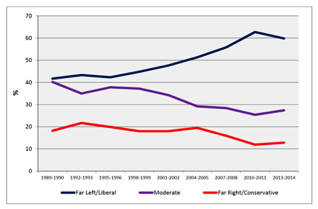 Later this would become less cynical and incorporate activist elements. For the generation that came of age at this time — the academic currents and the broader world outside, including opposition to the Vietnam War, memories of the Civil Rights Era and the radicalism of the 1960s —would have been exposed to a powerful cocktail of influences and passions in this time of youthful idealism. For young adults, the decade after age fourteen is particularly formative and shows up in an unusual and relatively extreme Democratic lean for individuals born between 1950 and 1954.[31] Even beyond this narrow cohort, it stands to reason a disproportionate portion of young activists may choose to remain at universities where they felt they found their purpose and then shape upcoming young minds. Students self-select and those temperamentally on the left end of the spectrum will be the most likely to adopt these beliefs even if the overall proportion of left-moderate-right students remain unchanged — this produces a small, motivated minority within academia against a passive majority and shifts the Overton window so that self-identification on surveys has limited use in determining how universities shift beliefs.