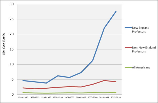 By 2005 individuals born in 1940 started becoming sixty-five. These individuals would have finished high school by 1958, undergraduate studies around 1962, and masters and doctorates in the following few years. The cohort immediately after would have spent more of their formative years in the activist late-1960s. In fact, another analysis that separates partisan skew in the professoriate by geographic region shows an accelerating spike beginning in 2005 in New England: